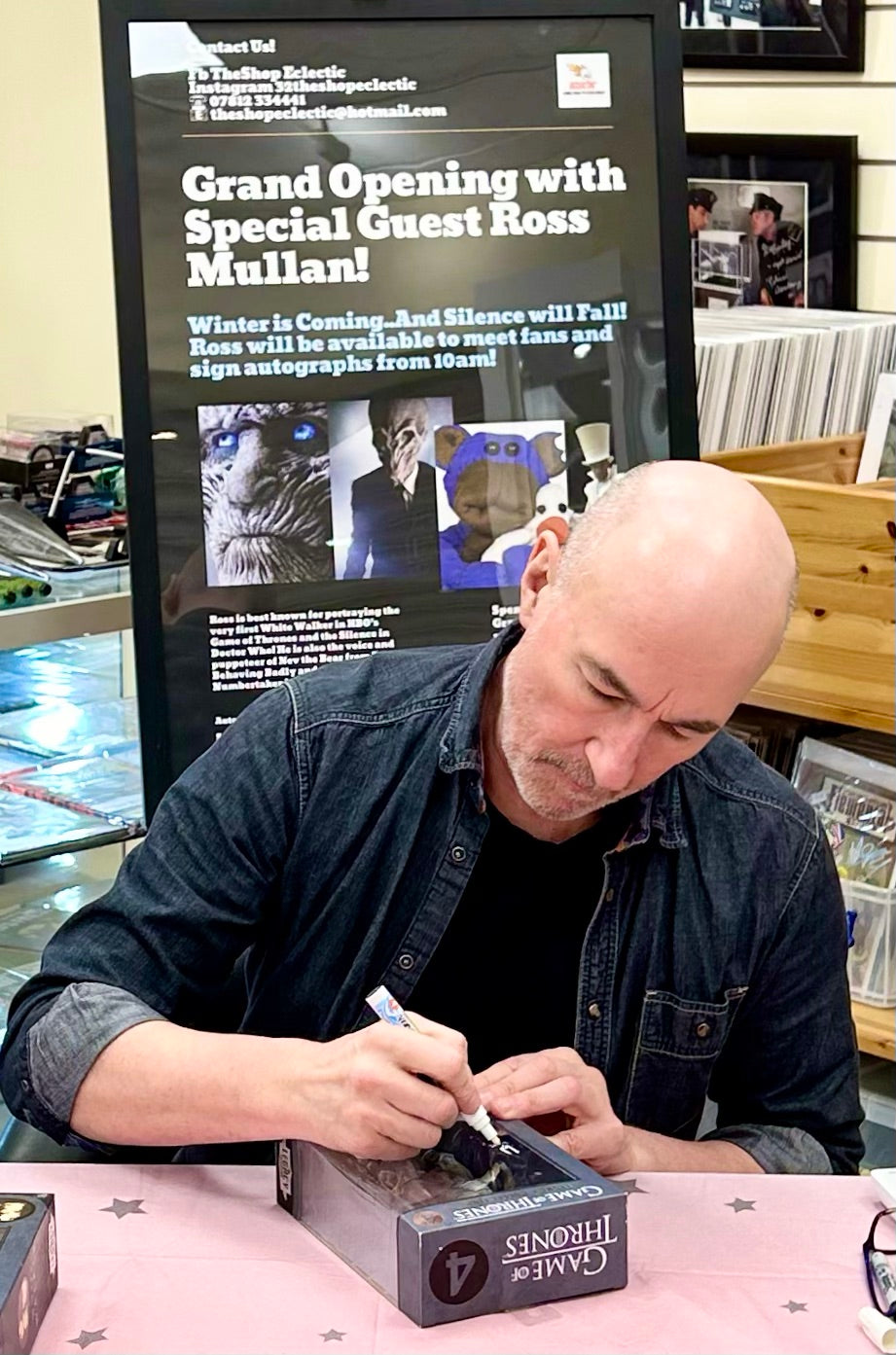 - Figure hand signed by Ross Mullan at the Grand Opening of our new store in January 2024. Ross portrayed the original White Walker on the horse that leads the Undead Army in Season 2, the White Walker that tries to steal Gilly’s baby and is killed by Samwell Tarly in Season 3 and the White Walker that delivers Craster’s baby son to the Night King in Season 4