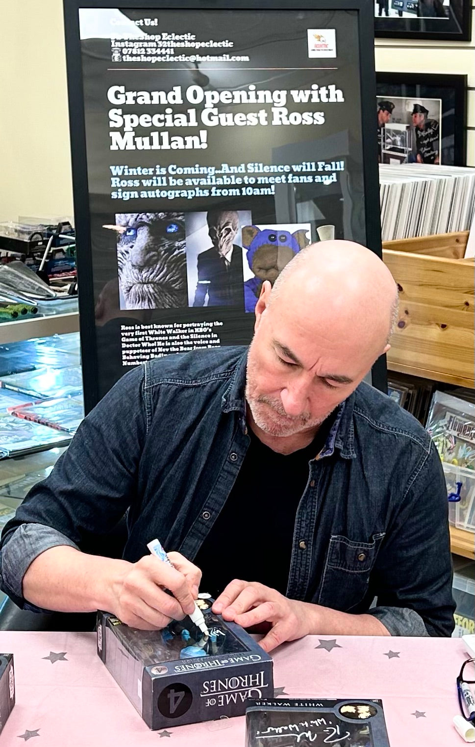 - Figure hand signed by Ross Mullan at the Grand Opening of our new store in January 2024. Ross portrayed the original White Walker on the horse that leads the Undead Army in Season 2, the White Walker that tries to steal Gilly’s baby and is killed by Samwell Tarly in Season 3 and the White Walker that delivers Craster’s baby son to the Night King in Season 4